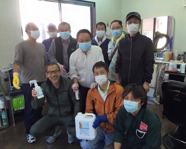 被災した理容店から物理的に土砂や泥水などを排除した状態を初期段階とします。その状態から災害時の行政から配布される薬剤を使用し、衛生復帰を行います。この時点になると、行政やボランティア組織から、衛生管理に使用できる薬剤が配布されてきます。そこには理容店における消毒でも馴染みがある薬剤が含まれてます。