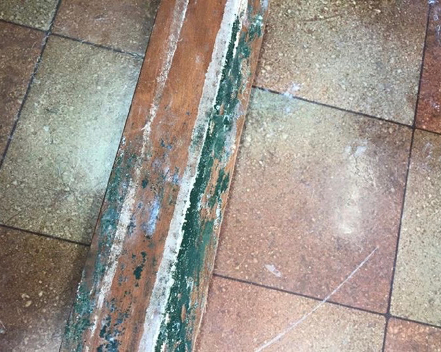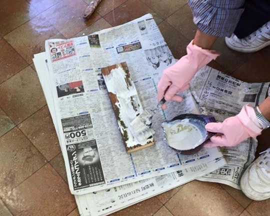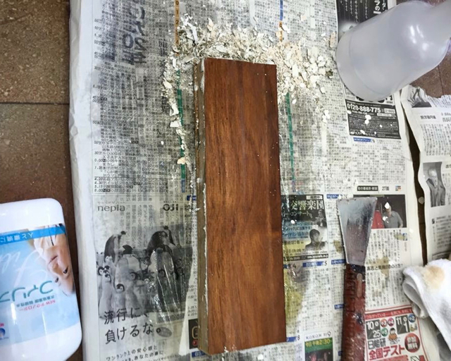 強アルカリ性のため、ゴム手袋・マスク・目を保護するためのメガネを着用して作業をおこなってください。まず、作成したペーストをカビが発生した箇所に塗ります。酵素の反応が進み抜けてしまうので、作成して直ぐに塗れるようにしてください。1時間ほど放置して自然に乾かせます。乾燥したペーストに弱酸性次亜塩素酸のフィリオ30(10倍希釈)を吹きかけて、中和しながら湿らせたペーストを剥がします。この時には、塩酸を使用して生成された二液生成法の弱酸性次亜塩素酸水は使用しないでください。剥がし終わった面は良く乾燥させた後に、エタノールを噴霧してから乾拭きして仕上げます。